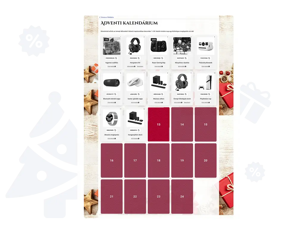Az Adventi kalendárium modul segítségével egy különleges, interaktív adventi naptárat helyezhetsz el webáruházadban, ahol december 1-24. között minden nap egy új meglepetés várja a látogatókat.